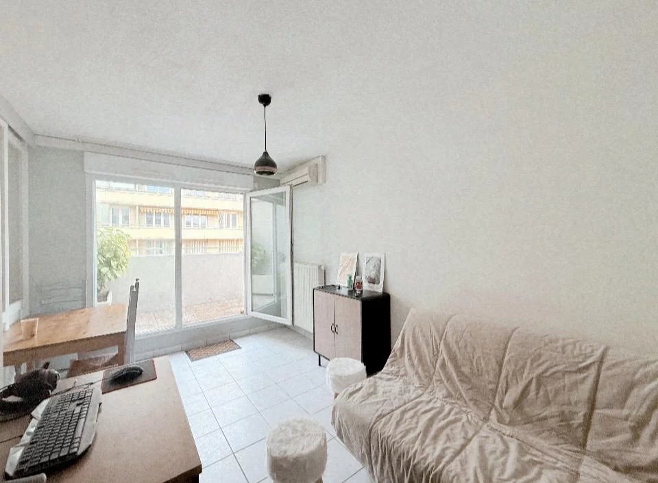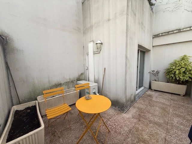 Une entrée avec placards, une salle d'eau, un wc indépendant, une chambre spacieuse avec placard, une cuisine équipée et un salon séjour donnant sur une belle terrasse de 8m².